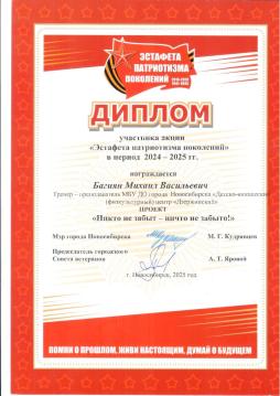 28 октября 2025 года награжден дипломом тренер-преподаватель Багиян Михаил Васильевич участник акции "Эстафета патриотизма поколения в период 2024-2025 г.г.